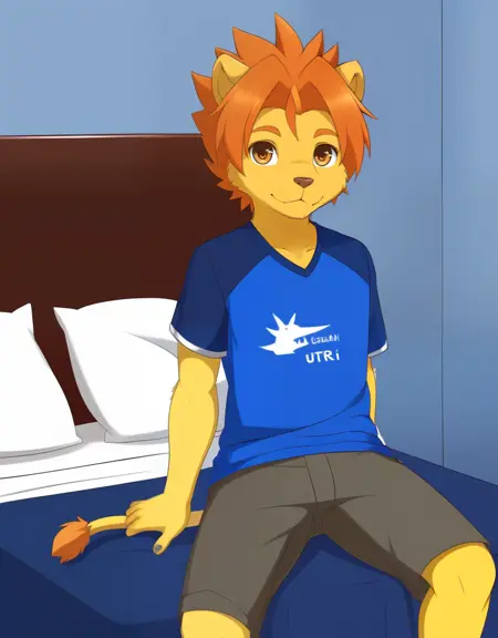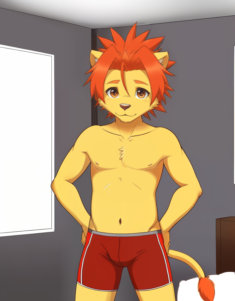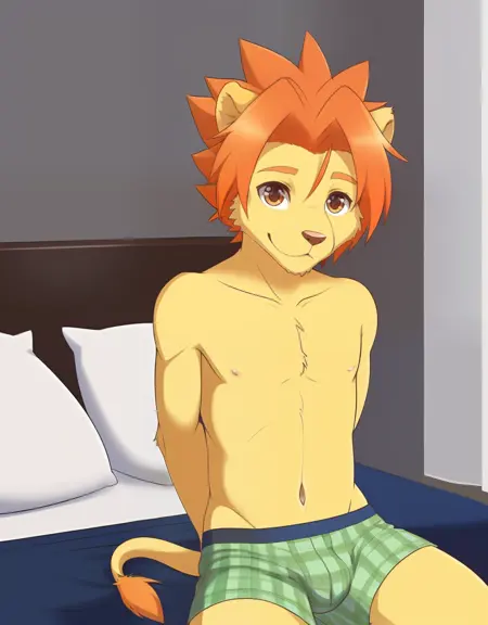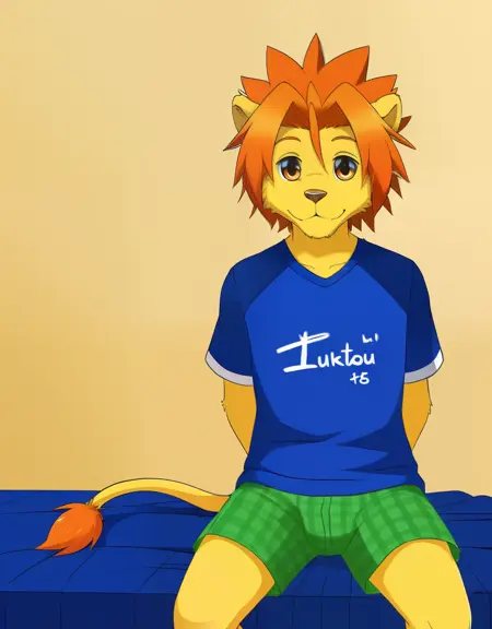 相关词:黄色皮肤,体毛,短发,刺状头发,橙色头发,红色头发,棕色眼睛,蓝色眼睛,狮子尾,猫尾,狮子男孩,猫男孩,狮子耳朵,猫耳朵,动物耳朵,动物鼻子,口鼻,短袖,T恤,衣服文字,棕色长裤,鞋子,运动鞋,男性内衣,格子图案 (v3-),游泳短裤,红色短裤