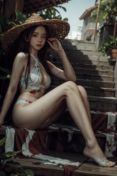Prompt words: ruanyi0157,bandages,blood,dirty,straw hat