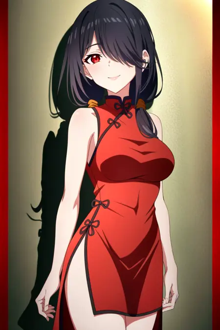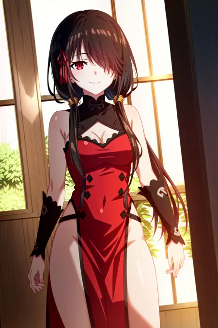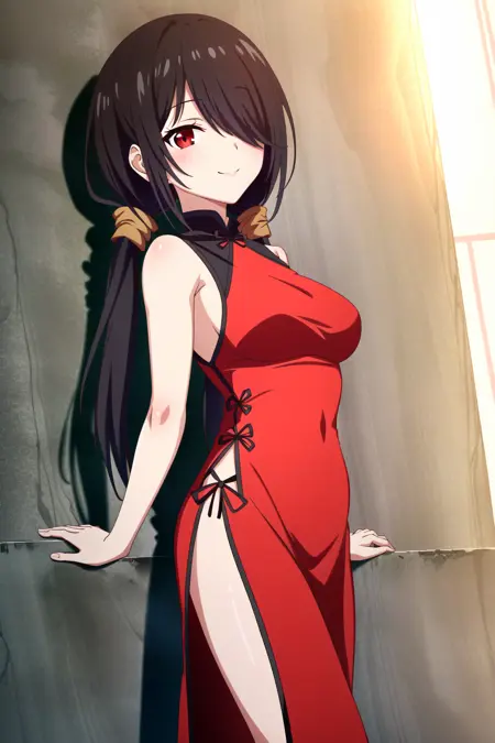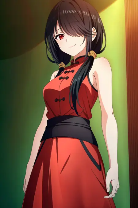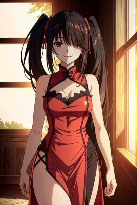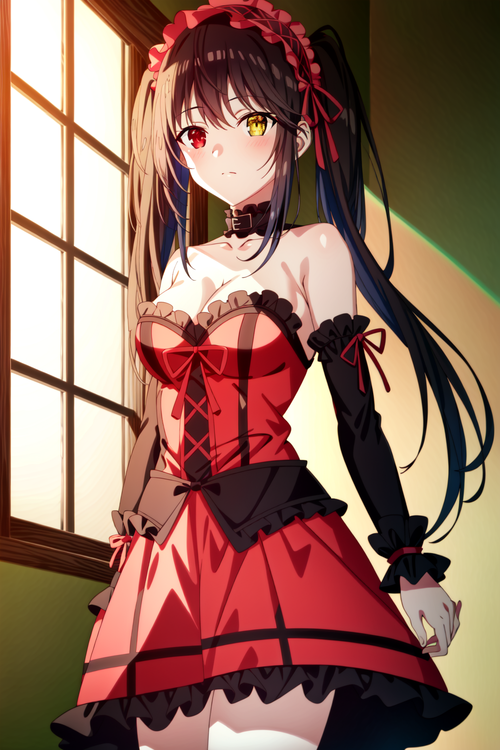 Kurumi Tokisaki, 1girl, solo, twintails, black hair, heterochromia, long hair, medium breasts, breasts, red eyes, cleavage, smile, yellow eyes, symbol-shaped pupils, hairband, red dress, sunset, bare shoulders, looking at viewer, choker, clock eyes, ribbon