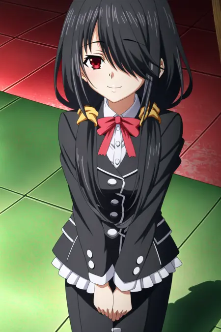 Kurumi Tokisaki, 1girl, solo, long hair, black hair, skirt, dark, school uniform, pantyhose, twintails, red eyes, jacket, blazer, black pantyhose, pleated skirt