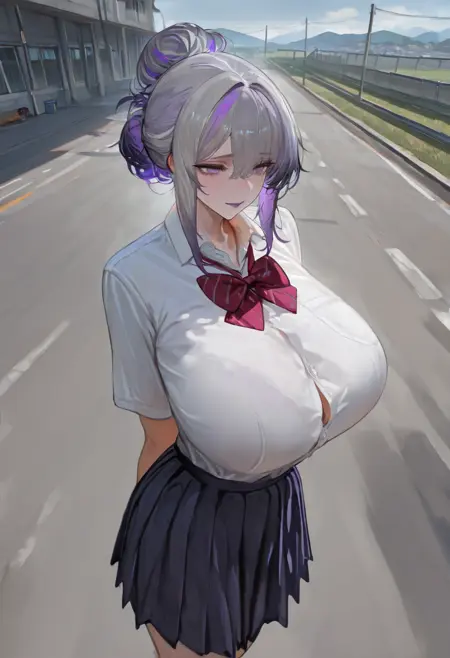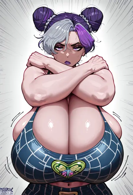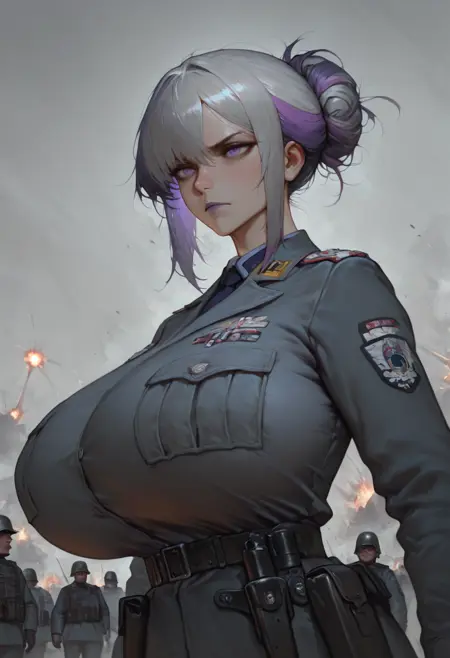 White purple hair, purple eyes, heavy top and a surprise down under 🐶.