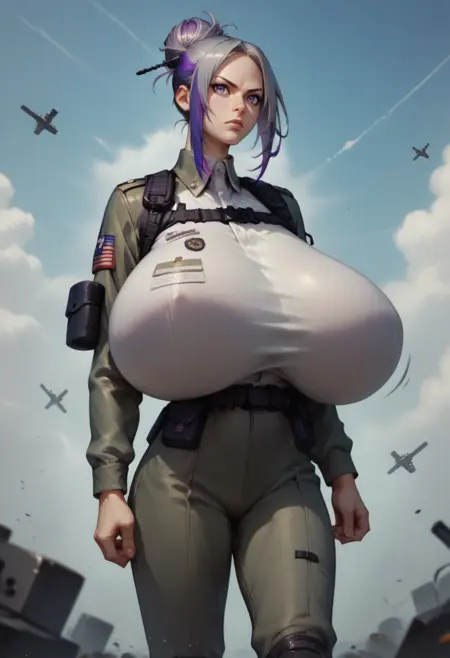 White purple hair, purple eyes, heavy top and a surprise down under 🐶.