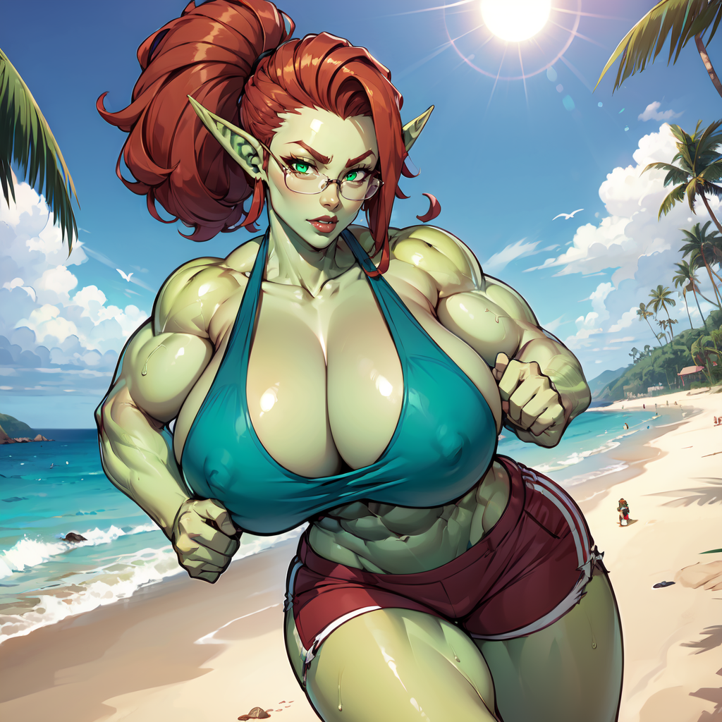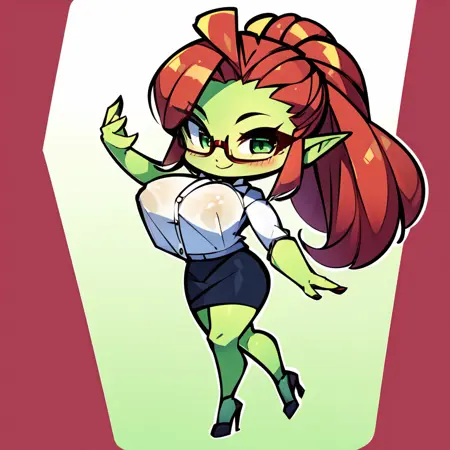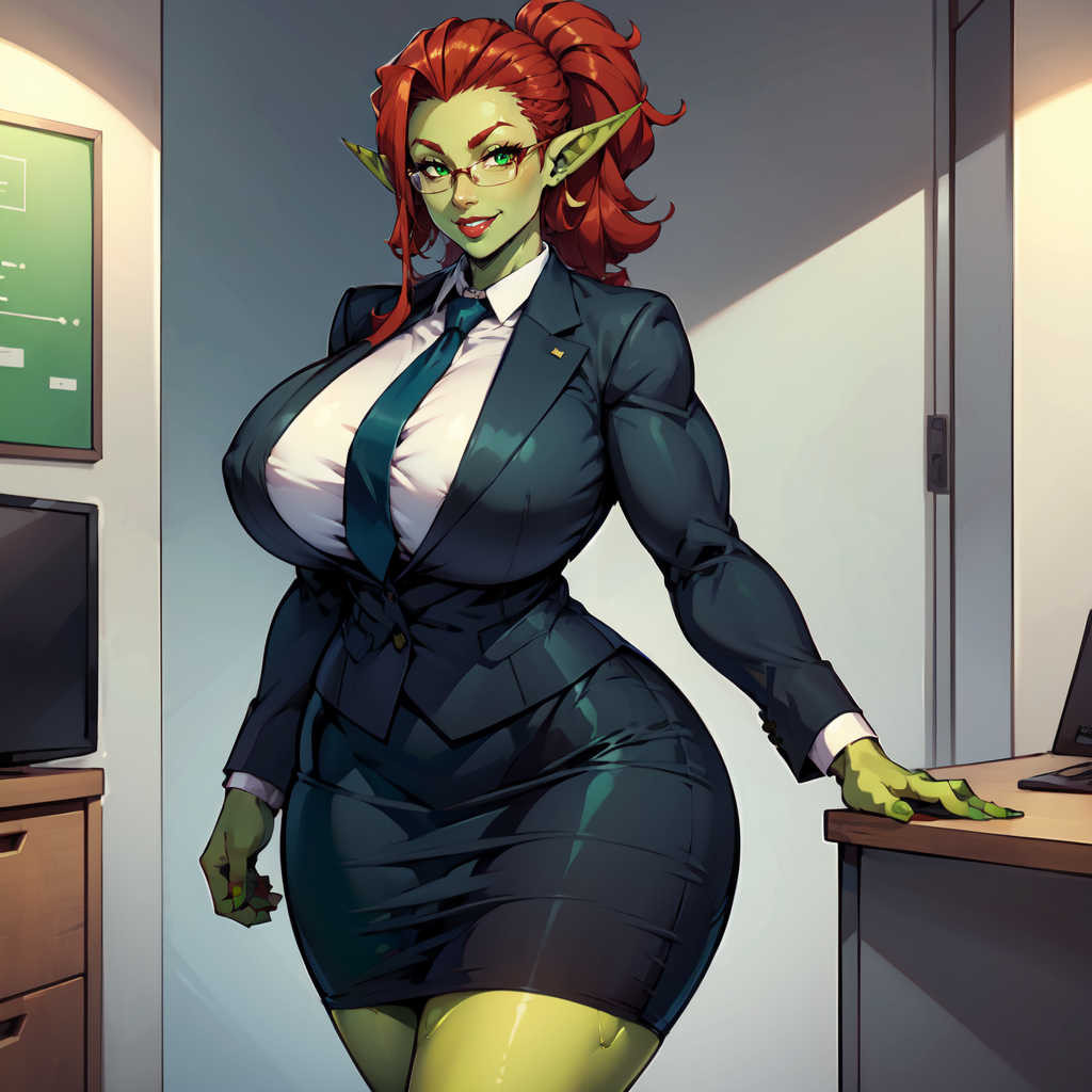 Recommended use around 0.6 - 0.9. Trained primarily on nude images along with office-lady, pencil skirt, collared shirt, high heels and some fur trim clothes for her barbarian past. Add prompts for muscular female, abs, biceps if you want to enhance muscle mommy vibes. I wanted to make this model because I found that prompting for "orc" usually makes the character exceedingly monstrous. This model consistently gives a female orc character that is conventionally attractive, with thighs that could crush your skull.