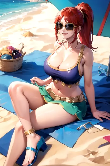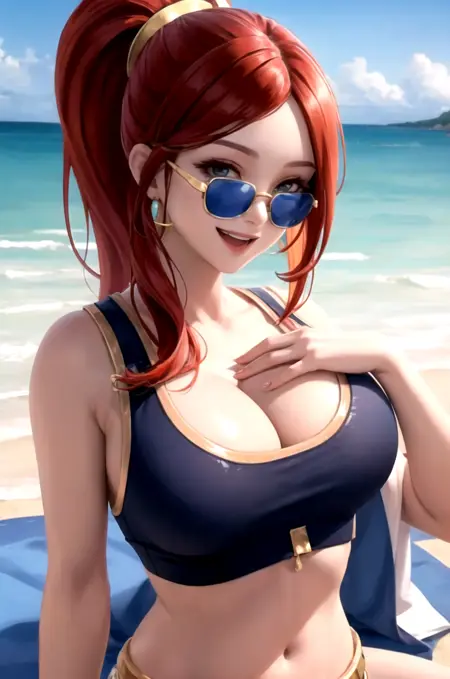 Use the prompt "eyewear on head" if you don't want the glasses on her face, might need to use "glasses" and "eyewear on face" as negative prompts.
