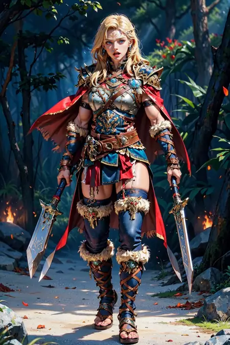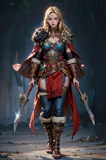 主要关键词:维京人,单人,站立,注视观众,(手持斧头,双持),盔甲,靴子,毛皮镶边,肩甲,腰带,裤子,护肩,斗篷,疤痕,纹身,面部纹身