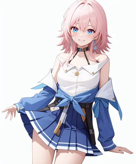 march7th,1girl,solo,white shirt,long sleeves,blue jacket,blue skirt,black choker,earrings,pleated skirt,bare shoulders