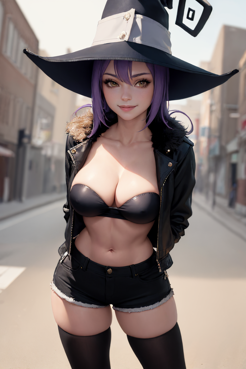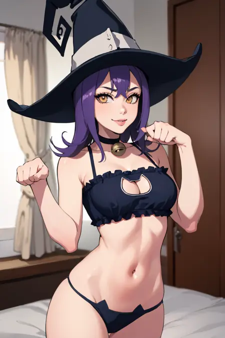 Add purple hair and yellow eyes if necessary. You can remove her witch hat and swap it out for cat ears.