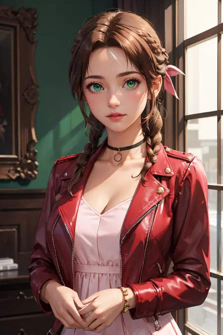 Activation words: aerith gainsborough, choker, red cropped jacket, hair bow, bracelet, brown boots, brown hair, sidelocks, parted bangs, green eyes, braid, pink dress