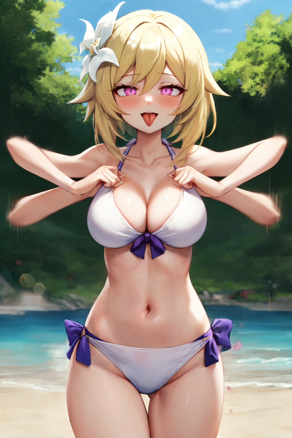 If unwanted text appears, put "sound effects, speech bubble, text" in the negatives.