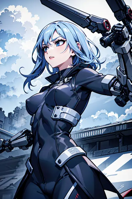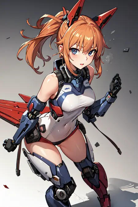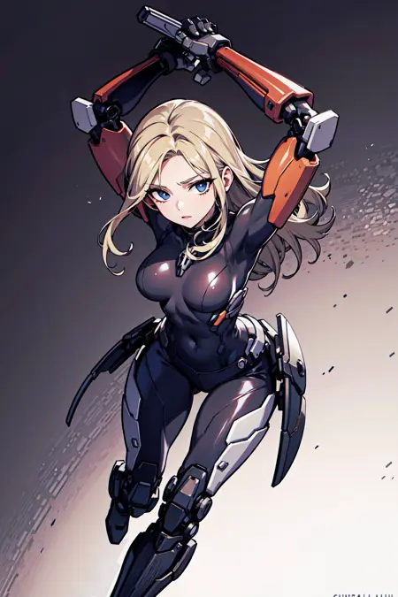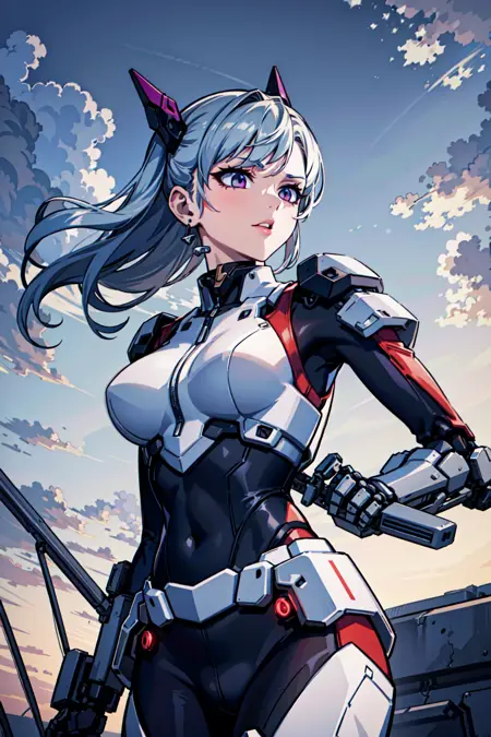 推荐的提示词是:机械臂、科技风服饰、机甲少女,