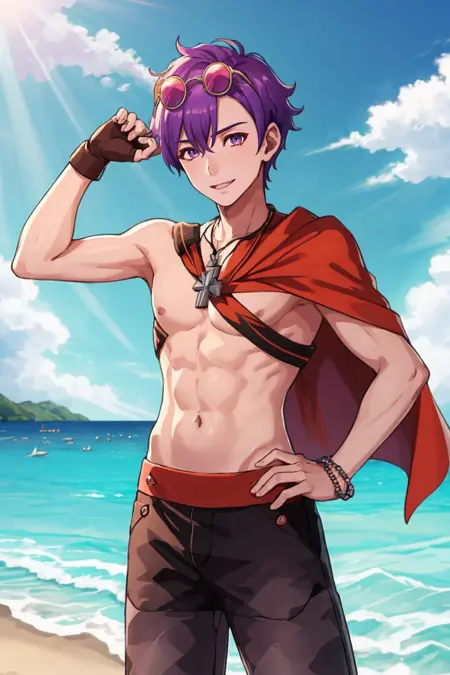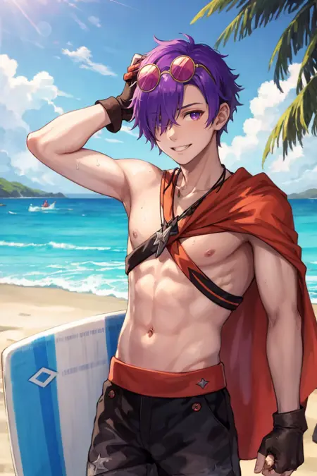 For his summer outfit it's "shezsum, cape, swimsuit, eyewear on head, fingerless gloves, necklace"