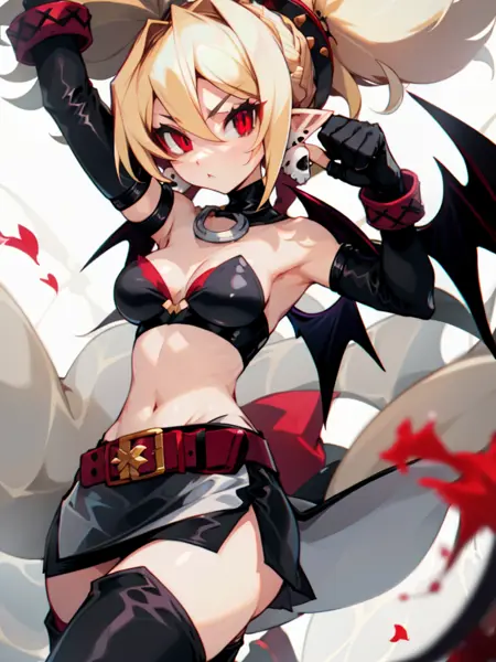Rozalin: rozalin, blonde hair, wide ponytail, red eyes, pointy ears, demon girl, demon wings, large breasts