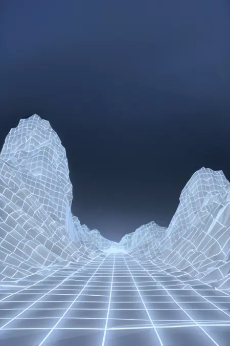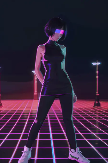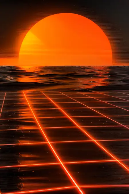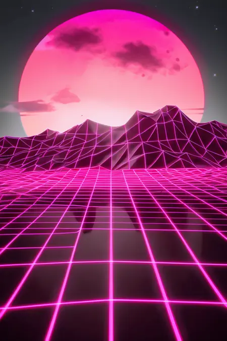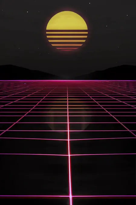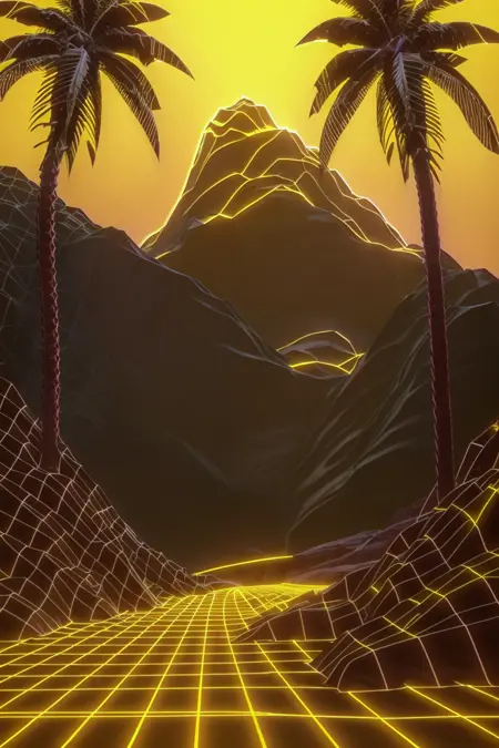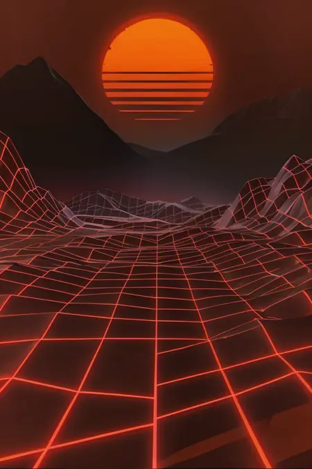 Wireframes, striped sunsets, a little bit of scanline and glitch style