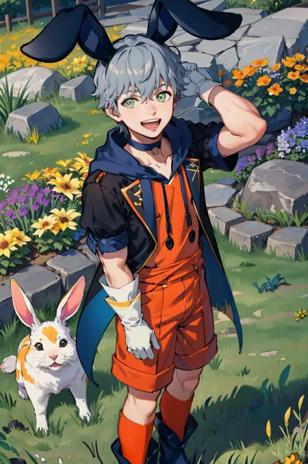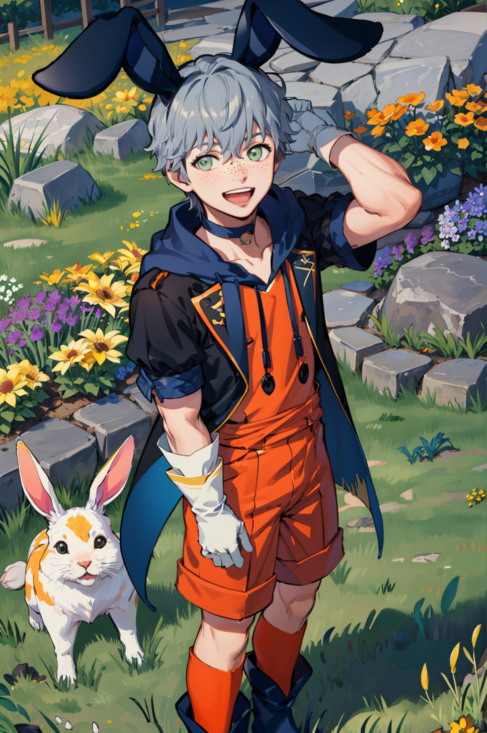 Budding Chivalry FEH: sprAshe, white gloves, blue jacket, fake animal ears, rabbit ears, white shorts, orange bow, puffy short sleeves, flower choker, blue footwear