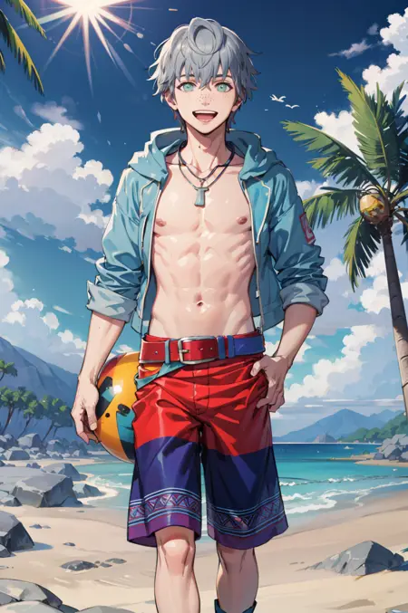 Fable Sea Knight FEH: sumAshe, navel, necklace, blue jacket, open clothes, male swimwear, swim trunks, belt, hood, sandals