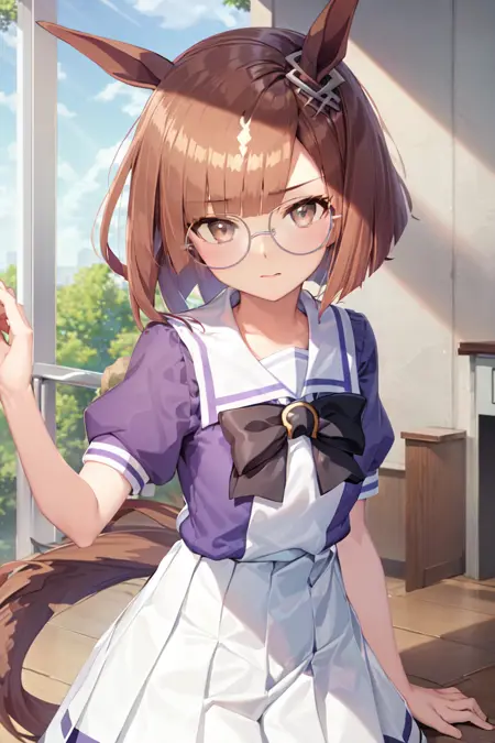 - tracen school uniform, summer uniform, serafuku, puffy short sleeves, purple bowtie, horseshoe ornament, sailor collar, sailor shirt, purple shirt, white skirt, pleated skirt, frilled skirt, miniskirt, zettai ryouiki, white thighhighs, brown footwear, loafers