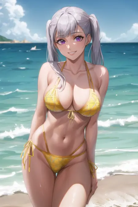 수영복, 비키니, 측면 끈 비키니 하의, (노랑 비키니:1.3), 야외, 해변, 모래, 물, 하늘, 낮, 구름