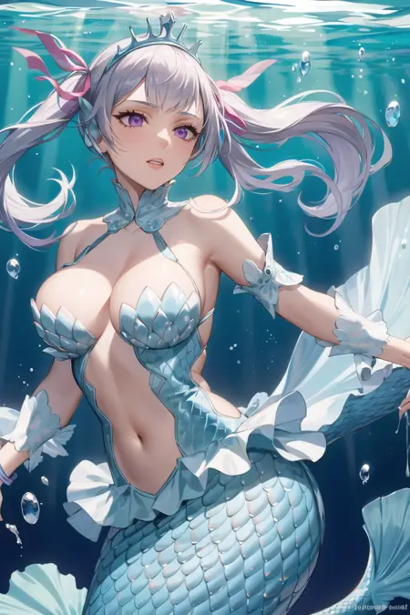 볼륨 있는 가슴, 티아라, 몬스터 걸, (물고기 여신:1.1), 물, 배꼽, 보드라운 어깨, 머리 리본, 껍질, 비늘, 해저,