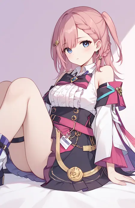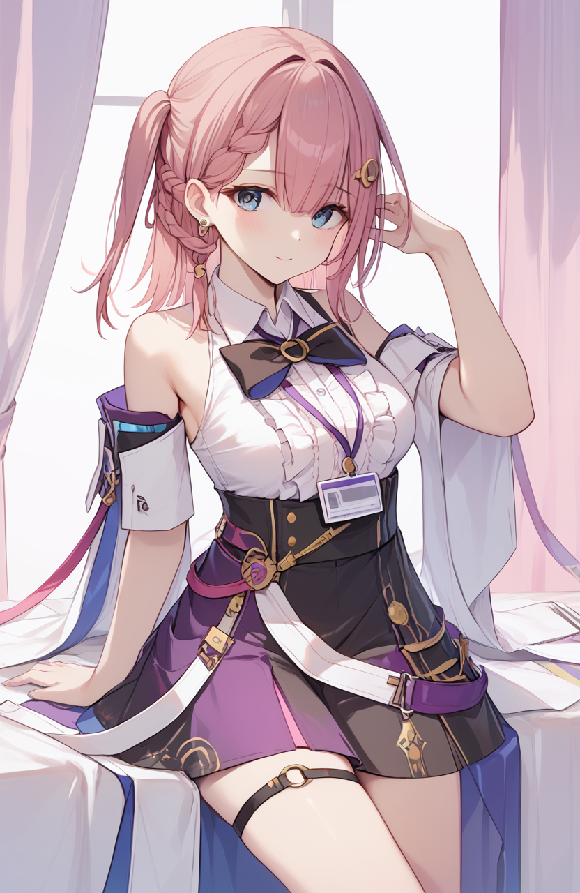 xtasta,a girl named xtasta,1girl,braid,white shirt,sleeveless shirt,one side up,id card,detached sleeves,black skirt,black bowtie,center frills,collared shirt,thigh strap
