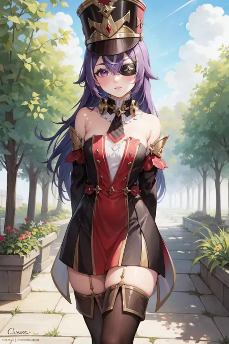 chevreuse, 1girl, solo, long hair, hat, eyepatch, looking at viewer, gloves, hair between eyes, white gloves, bare shoulders, detached sleeves, dress, shako cap, one eye covered, boots