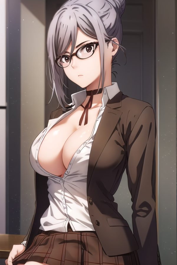 meiko shiraki, grey hair, glasses, hair bun, single hair bun, (brown eyes:1.5),