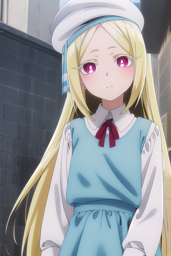 nero alice, long hair, blonde hair, (red eyes:1.3), bow, hair bow, (pink eyes:1.3), facial mark, forehead mark,