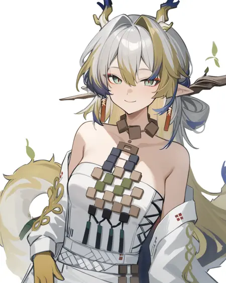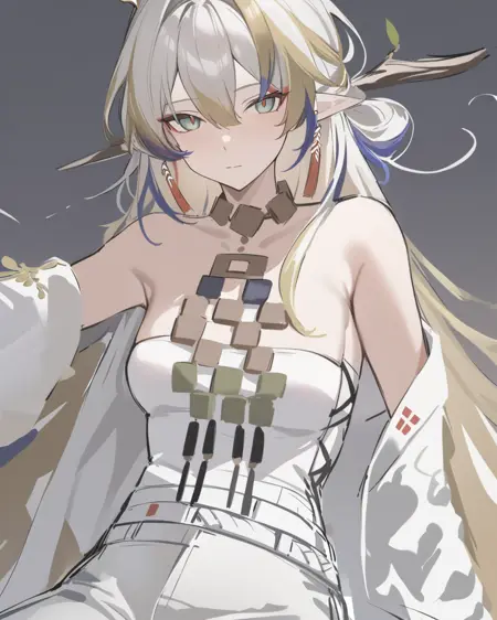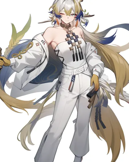 TAG:white_dress,white_coat,off_shoulder,yellow_gloves,bare_shoulders,collarbone,open_coat,strapless_dress,long_sleeves,green_hair,
