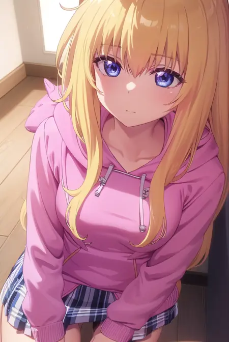 skirt, school uniform, jacket, shoes, socks, hood, plaid, hoodie, plaid skirt, black socks, (pink hoodie:1.5),