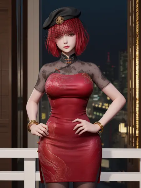 - NZanqierHYJL, 1girl, solo, jewelry, dress, pantyhose, red hair, bracelet, short hair, hat, looking at viewer,china dress, black pantyhose, short sleeves,see-through,cityscape, night,