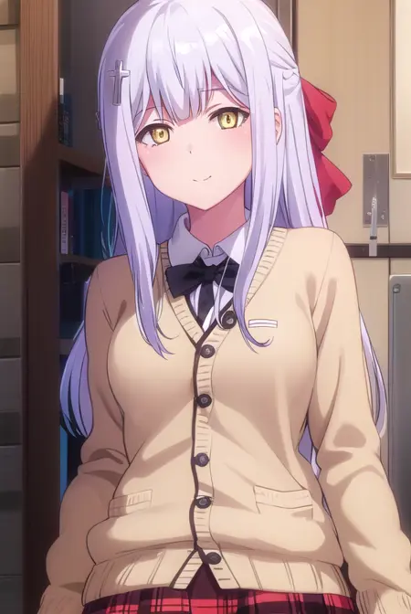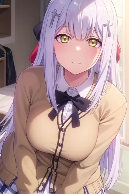 raphiel shiraha ainsworth, long hair, ahoge, white hair, hair ornament, cross hair ornament, (yellow eyes:1.3),
