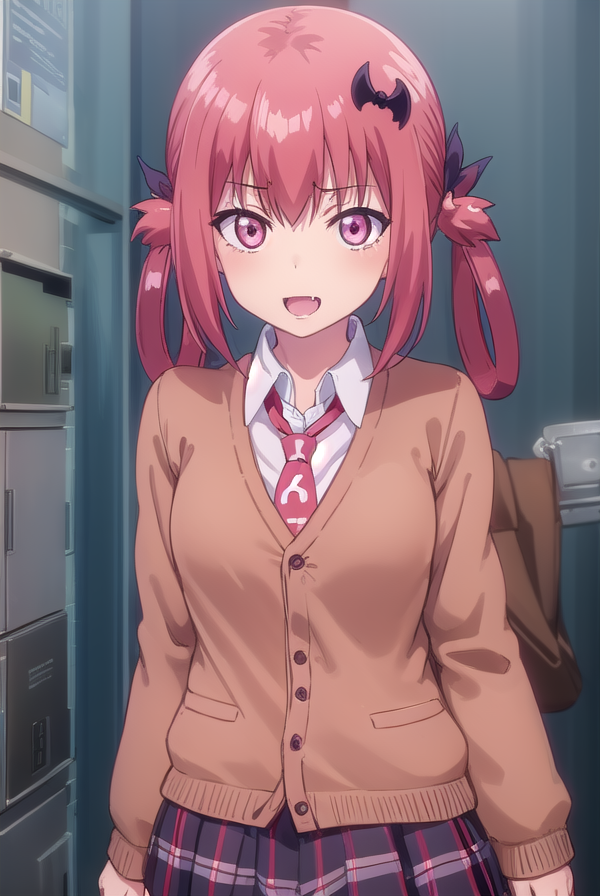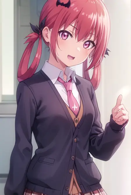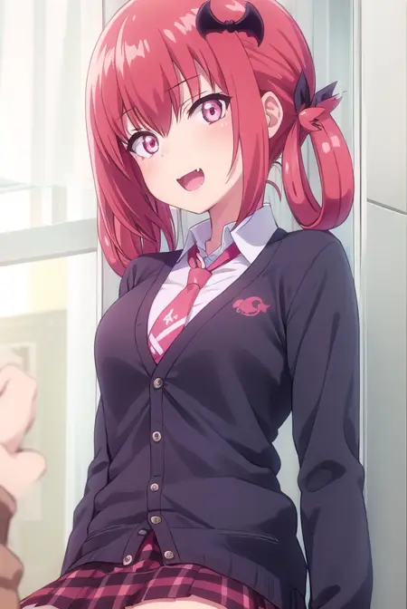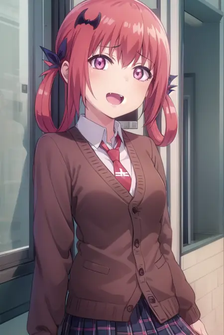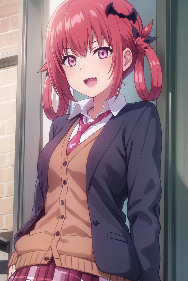 satanichia kurumizawa mcdowell, hair ornament, red hair, hair rings, bat hair ornament, (pink eyes:1.3), fang,