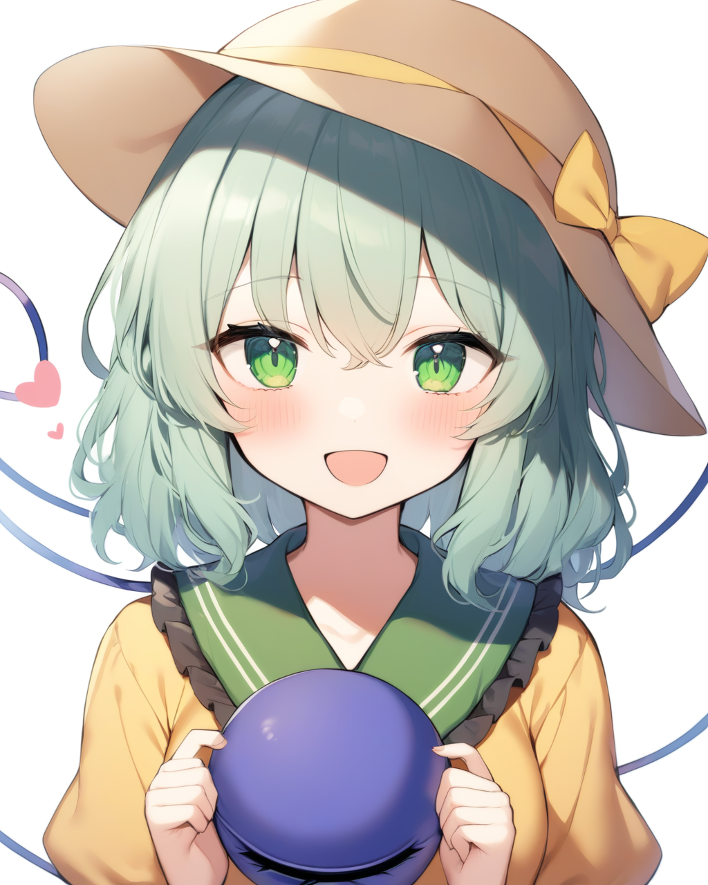 koishi_touhou, komeiji_koishi_touhou, 1girl, long_sleeves, wide_sleeves, yellow_shirt, heart_of_string, green_skirt