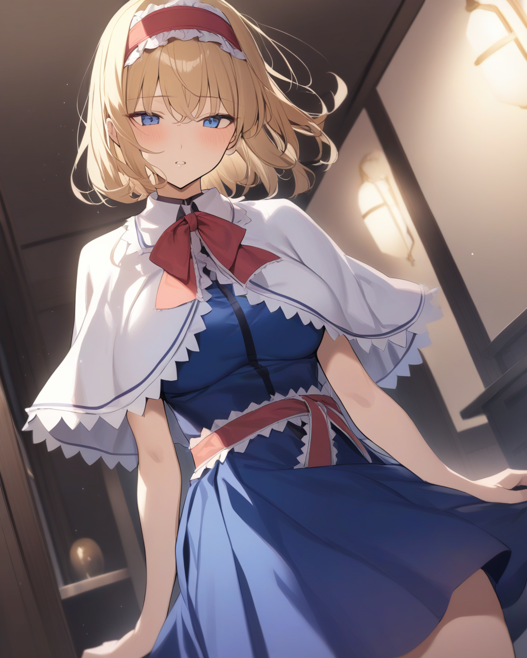 margatroid_touhou, 1girl, capelet, blue_dress, sash, bangs