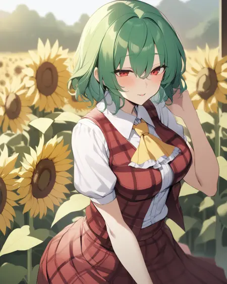 yuuka_touhou, 1girl, plaid_vest, plaid_skirt, ascot, skirt_set, sunflower