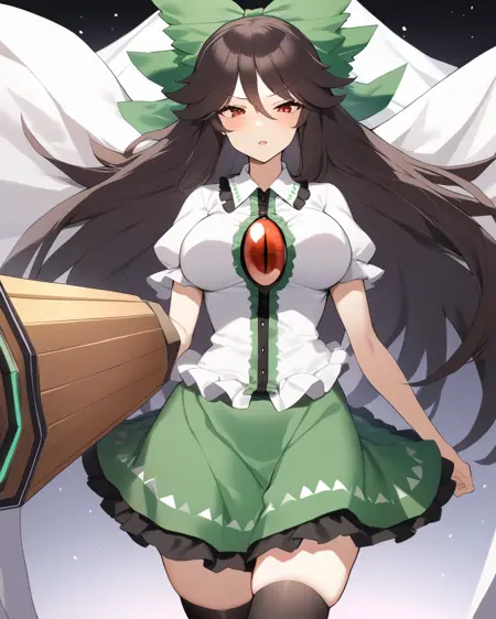 utsuho_touhou, 1girl, green_skirt, arm_cannon, cape, black_thighhighs