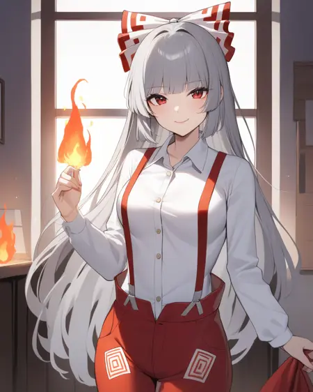 no_mokou_touhou, 1girl, suspenders, fire, white_shirt, pants, white_bow, red_pants
