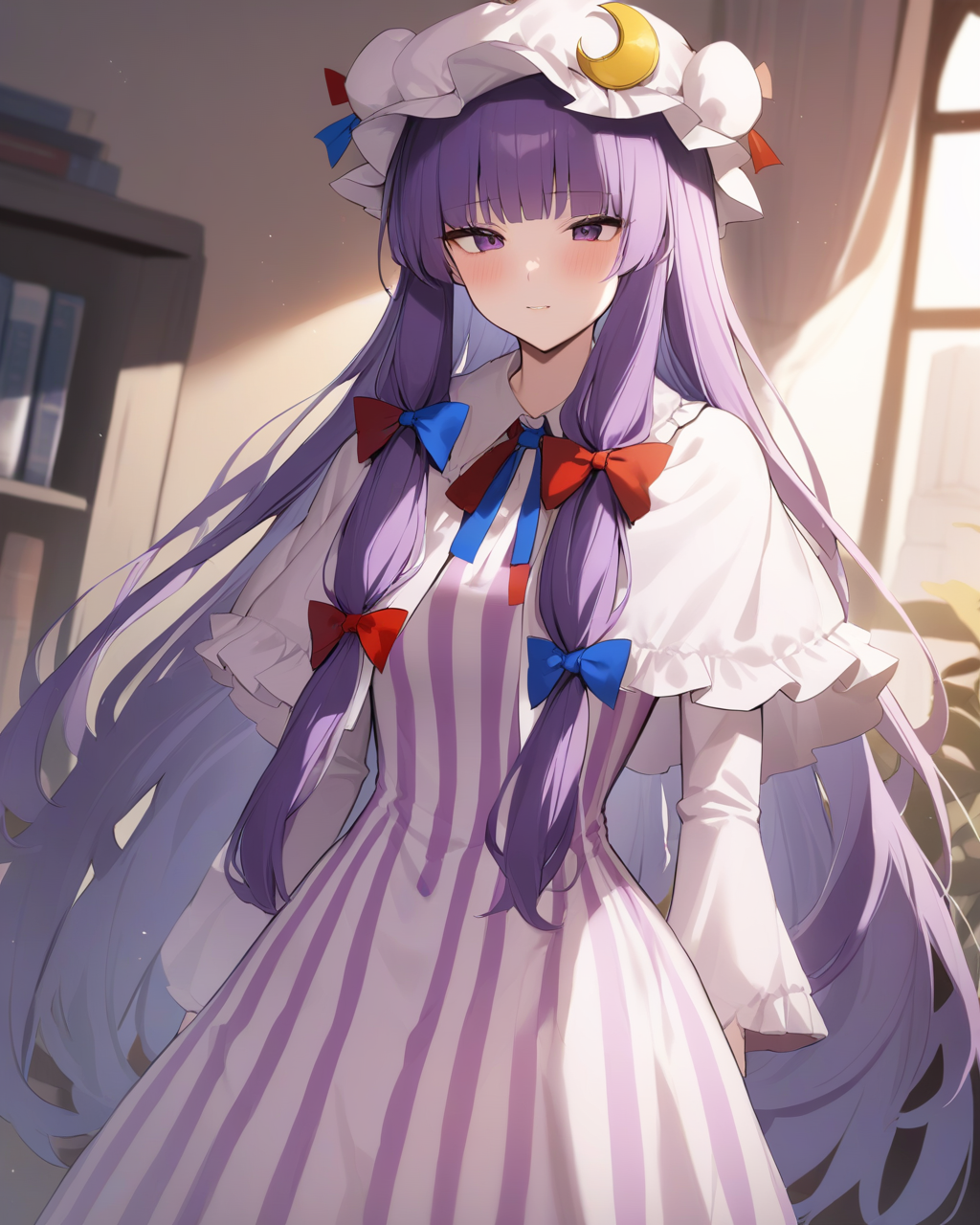 knowledge_touhou, patchouli_knowledge_touhou, 1girl, long_sleeves, striped_dress, capelet