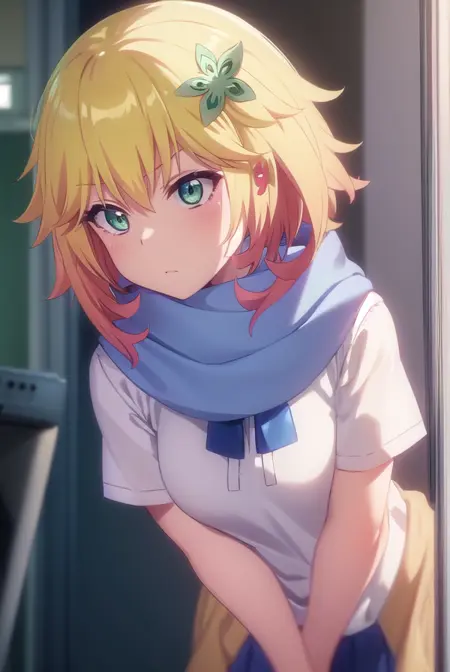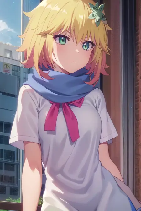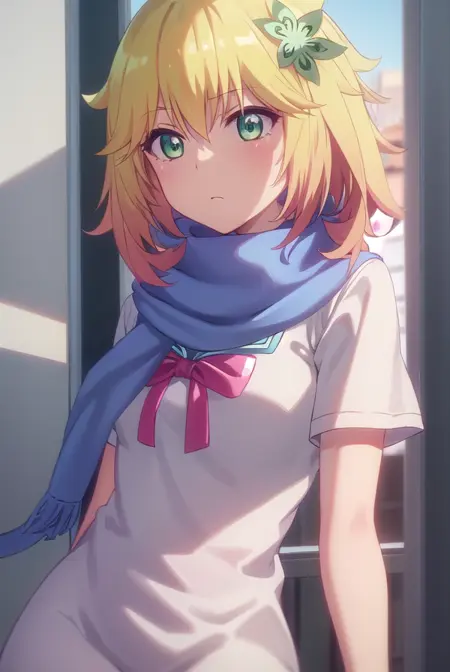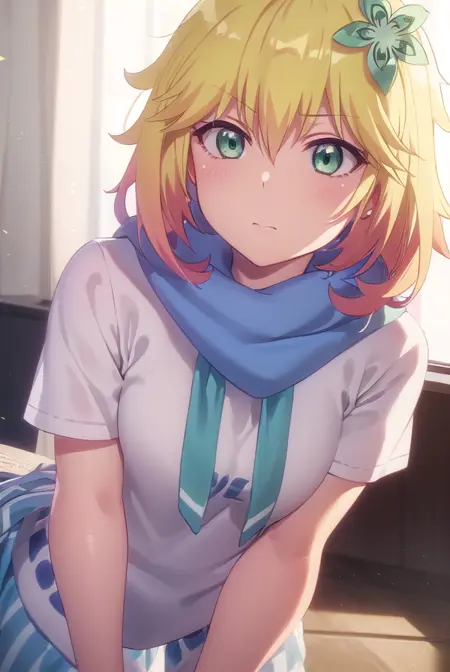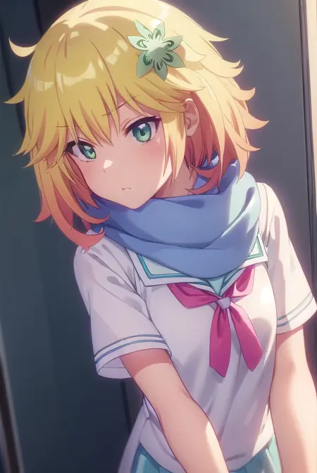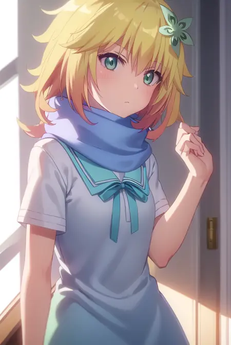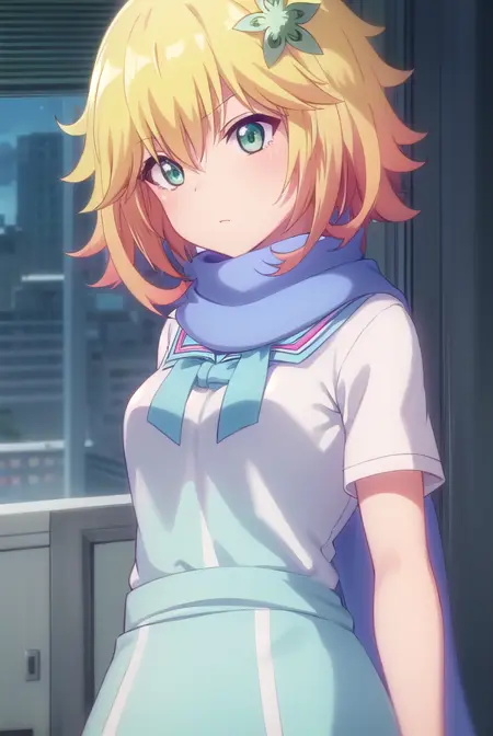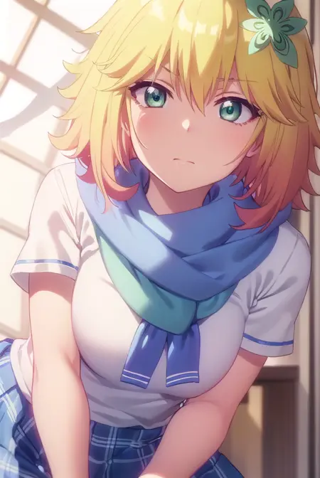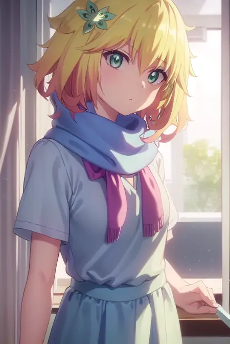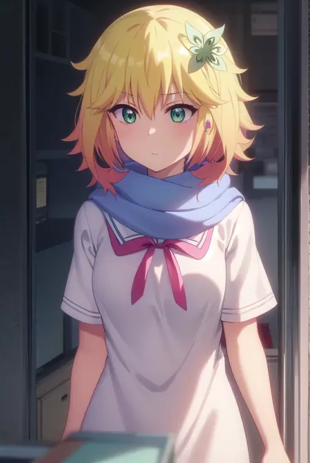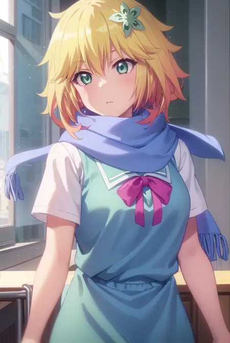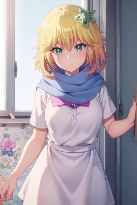 tapris sugarbell chisaki, short hair, blonde hair, hair ornament, (green eyes:1.3), flower, hair flower,