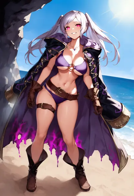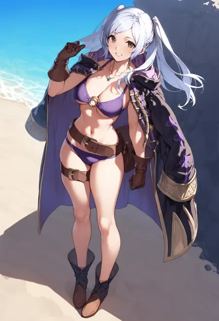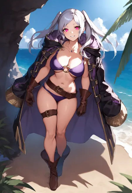 Add "necklace,robe,o-ring bikini,gloves,belt,thigh strap,boots" for her summer look.