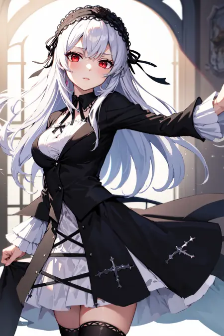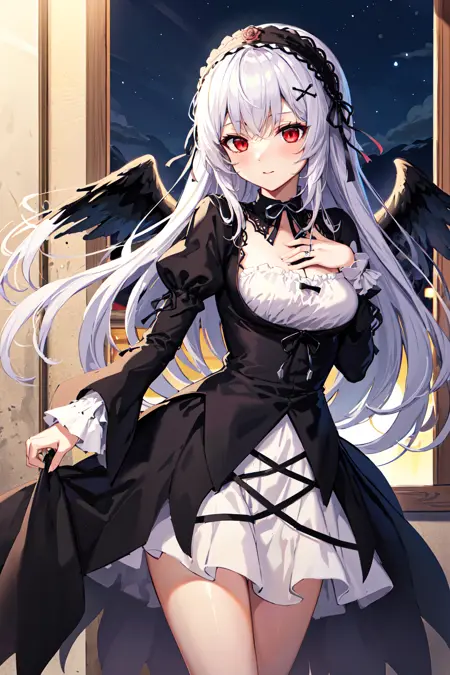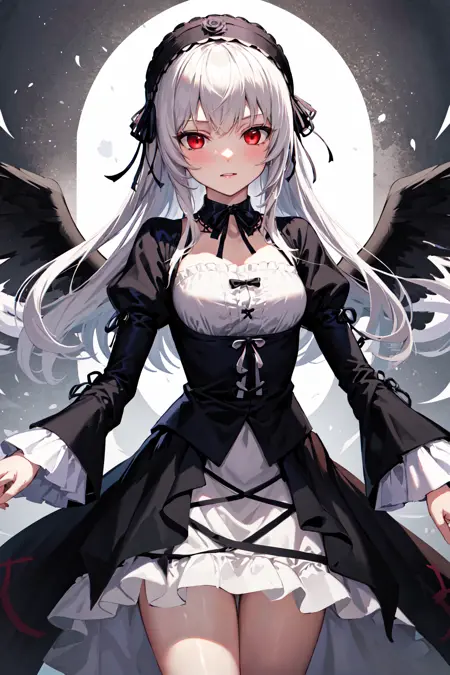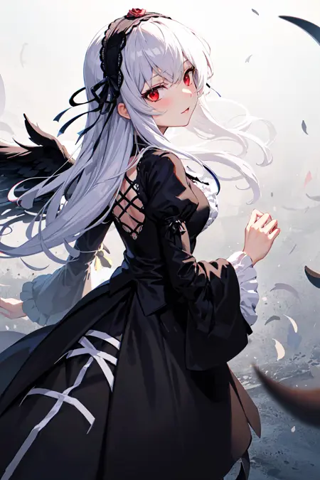 sui1, 1girl, solo, suigintou, red eyes, long hair, gothic dress, white hair, flower hair ornament, long sleeves, gothic hairband, ribbon, black dress, black wings