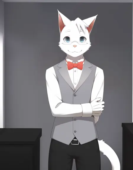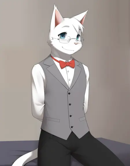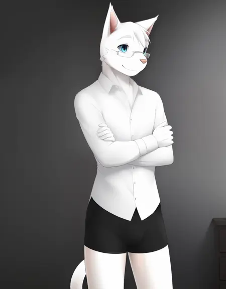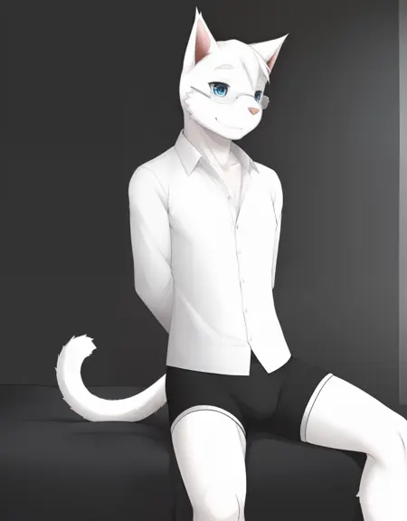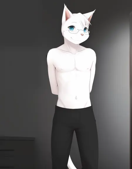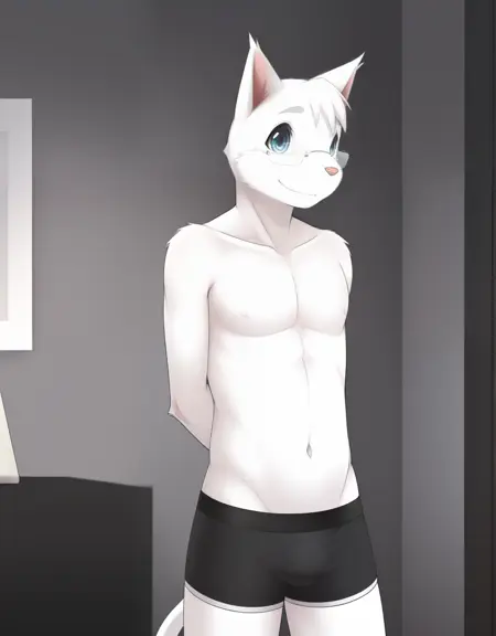 관련 단어: 흰 털, 흰 피부, 몸 털, 단발, 흰색 머리, 파란 눈, 아쿠아 눈, 고양이 꼬리, 고양이, 고양이 소년, 흰 고양이, 고양이 귀, 동물 귀, 동물 코, 코, 안경, 검은 남성 속옷