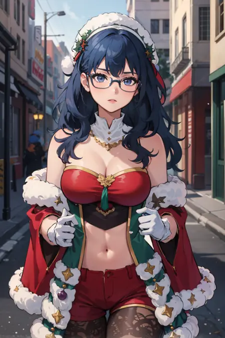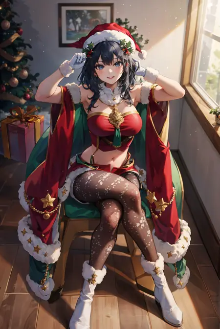 전체 옷차림: xmasBylethF, 머리 장신구, 흰 장갑, 산타 모자, 배꼽, 팬티스타킹, 단축바, 허리, 털 장식, 크리스마스, 흰 부츠