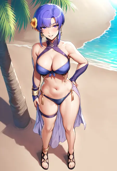 Add "earrings,criss-cross halter,purple bikini,bracelet,bridal gauntlets,waist cape,thigh strap,anklet,sandals" for her summer look.