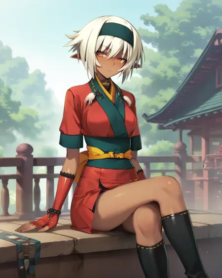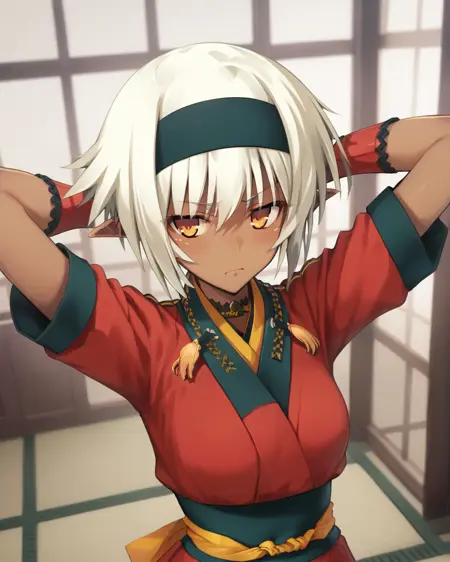 Base Outfit: hairband, japanese clothes, fingerless gloves, sash, choker, short kimono,