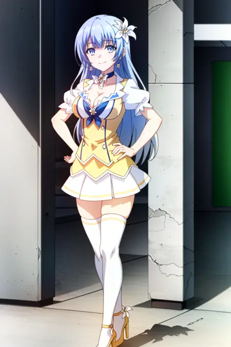 Miku Izayoi, 1girl, solo, gloves, hair ornament, blue hair, long hair, dress, crescent, blue eyes, aoki reika, white gloves, flower, choker, crescent hair ornament, jewelry
