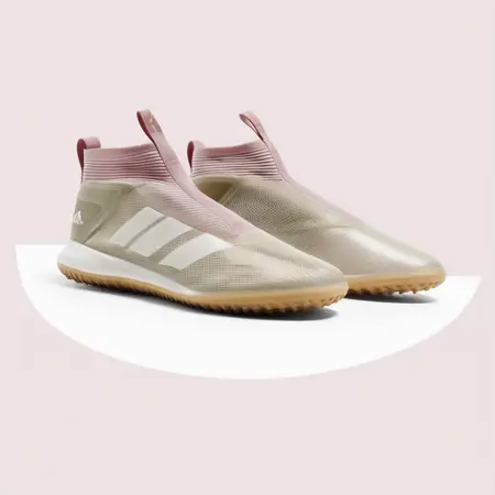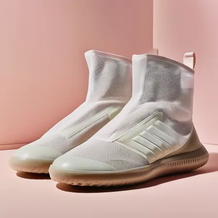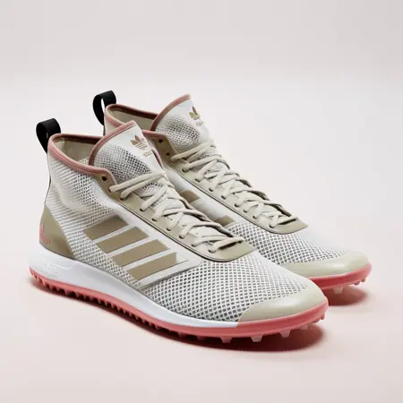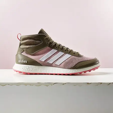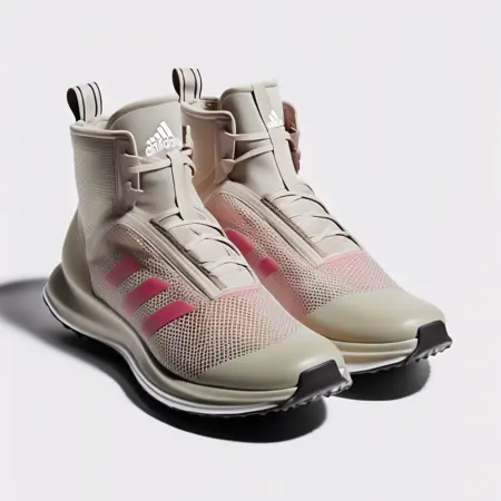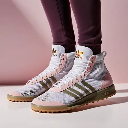 Prompt: pink colors The base of the product has flat boots from the Adidas brand, dark olive in color, with a slight shade, a circle with the logo text ((AHZ)) on it, and a mesh back for all of the above in pale white with a little transparency.
