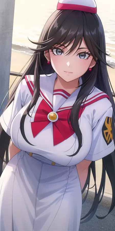 Summer_Himeya_company_uniform_White_long_dress_White_crop_top_Red_bowtie_Short_sleeves_Side_slit: 여름 히메야 유니폼.