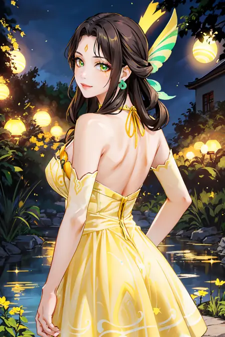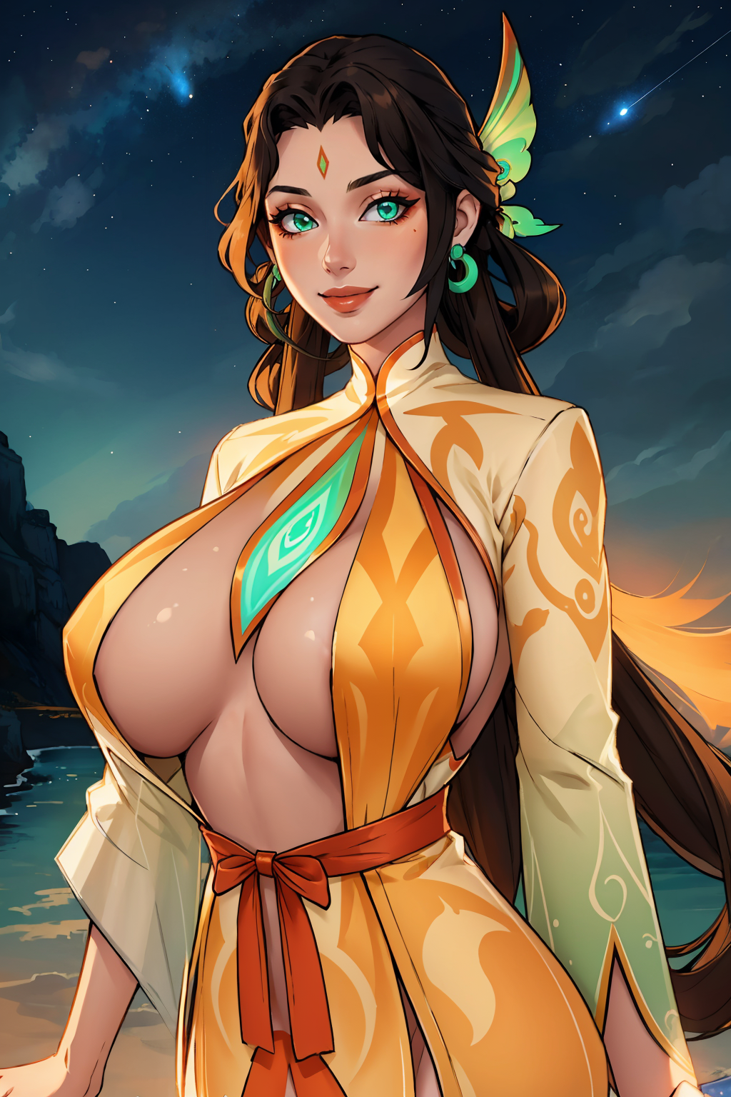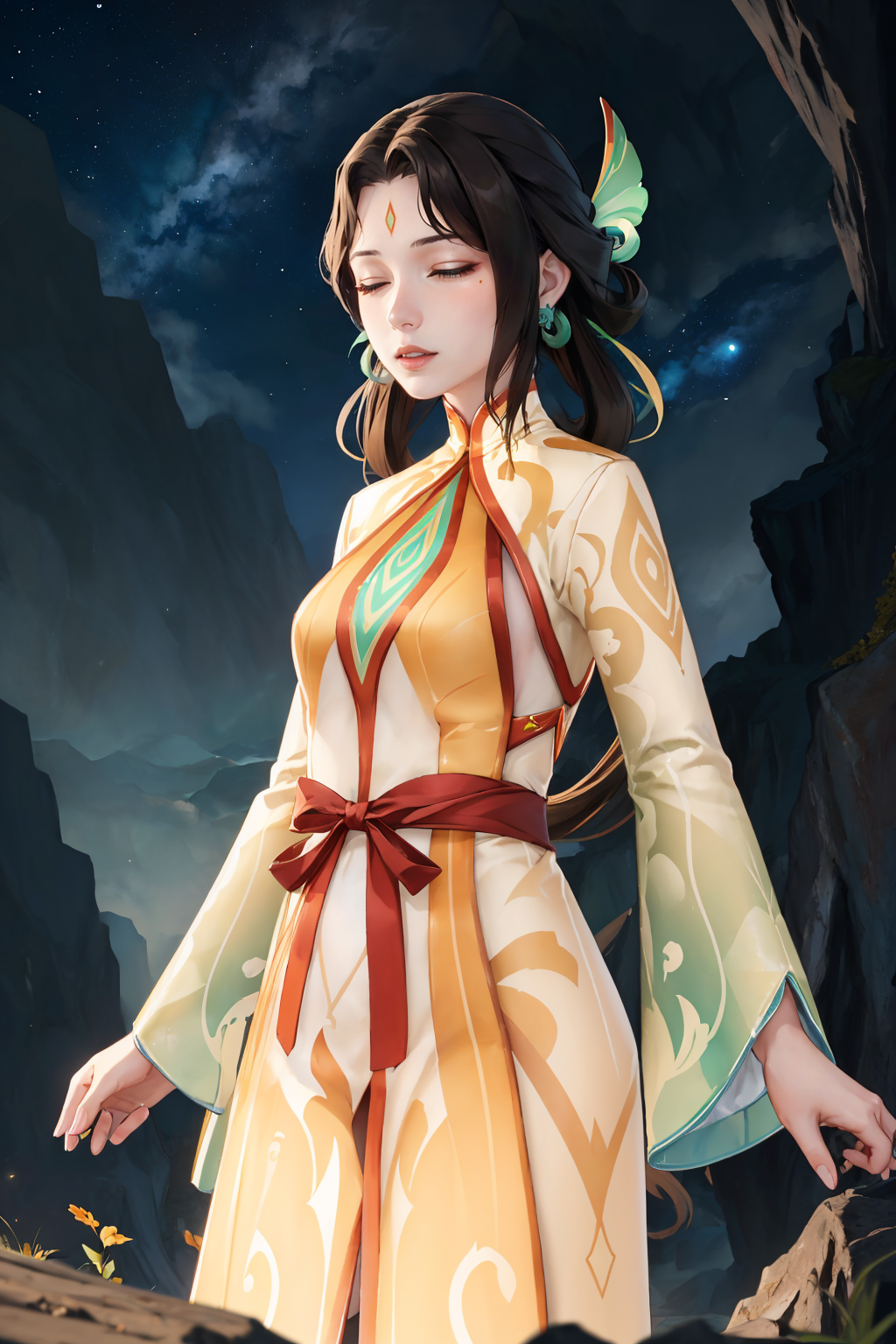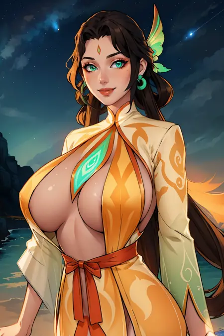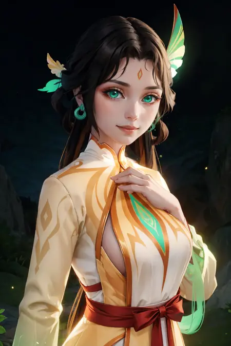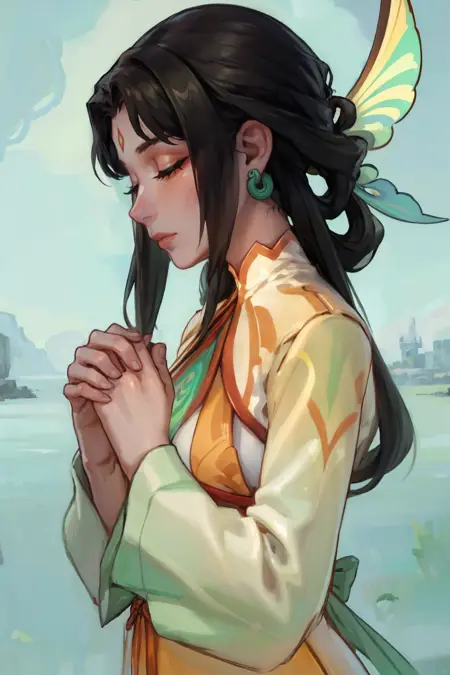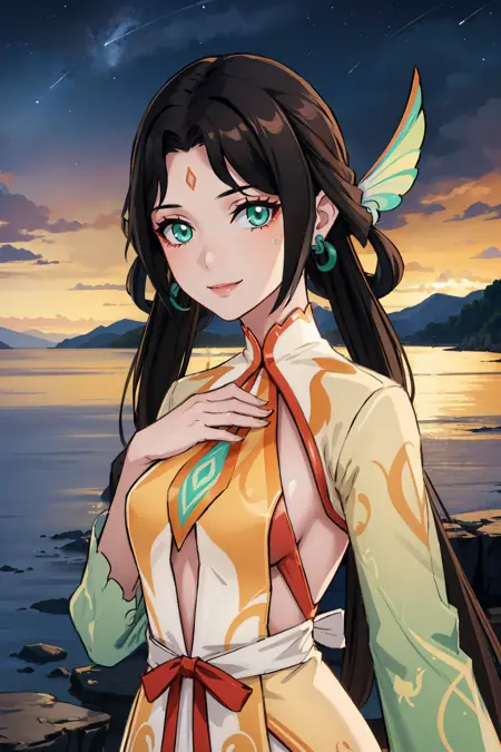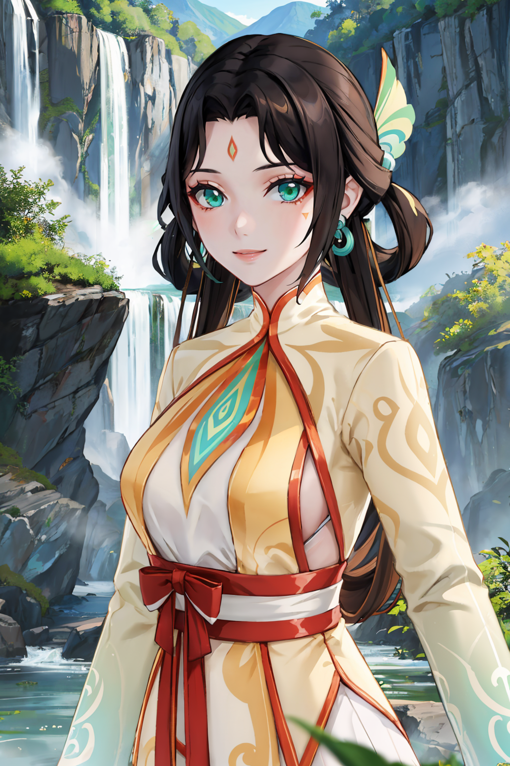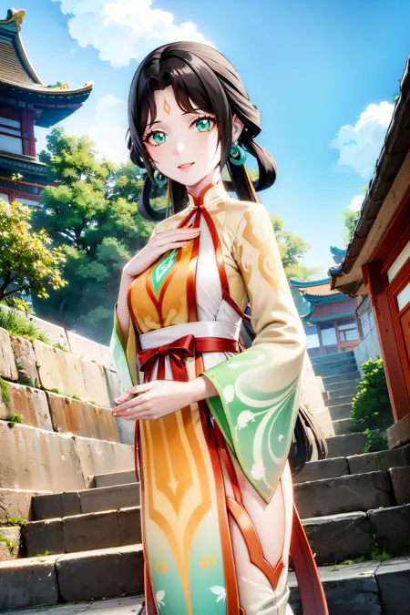 Add "hair ornament, long hair, hair rings, earrings, forehead mark, orange and green dress" for her typical look.