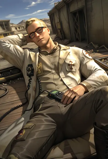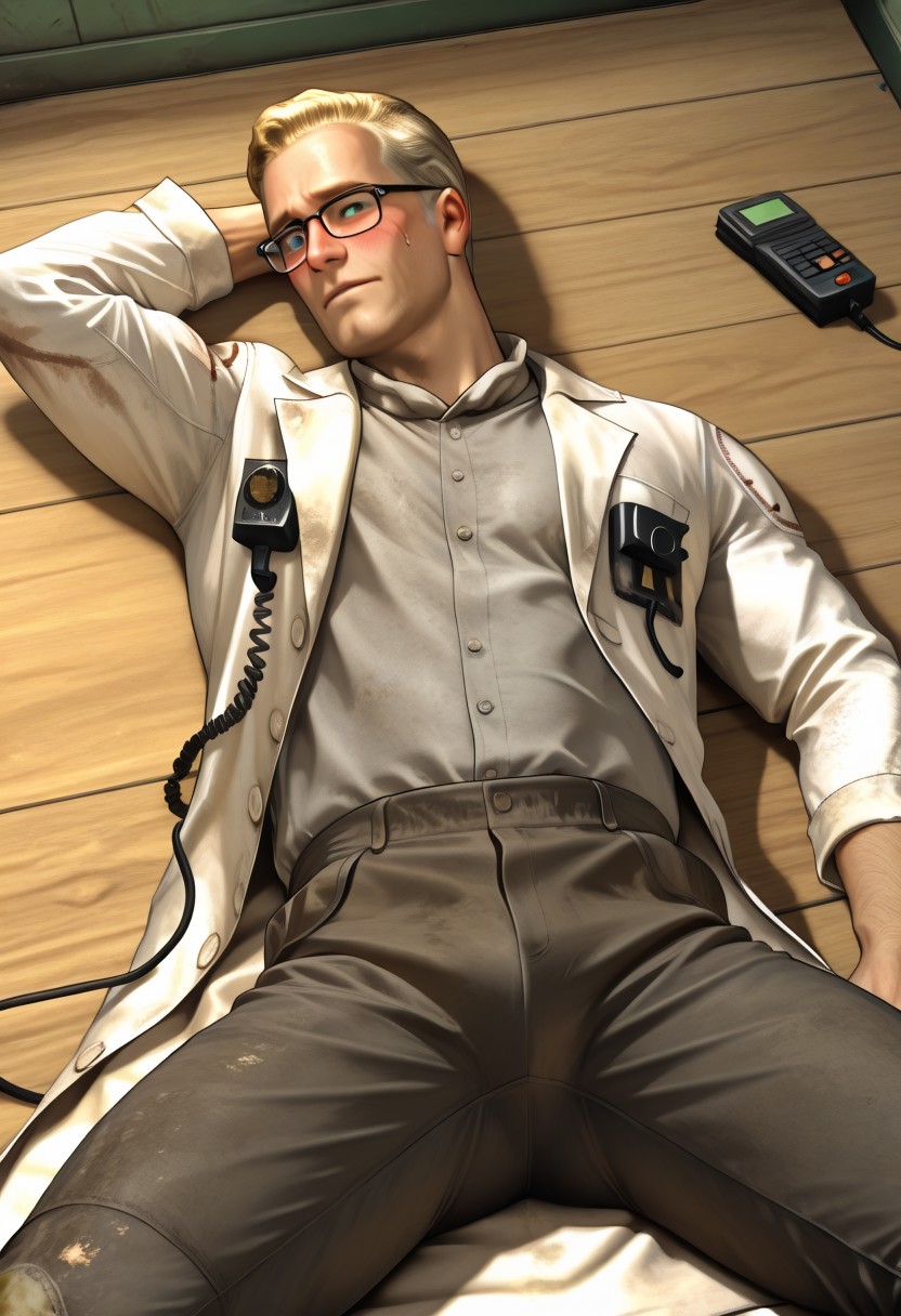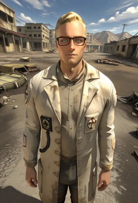 Prompt: blonde hair, short hair, green eyes, wore glasses, handsome, grey collared shirt, white lab coat, military pants, black combat boots