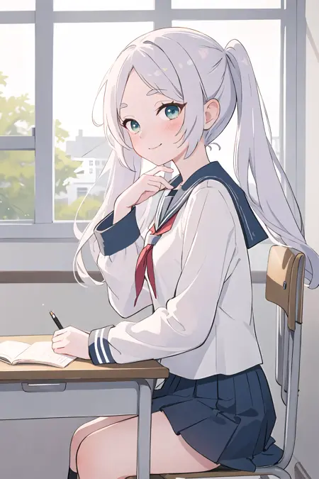 For SD 1.5 model, if you see wrong bangs or hair color, add"silver hair, parted bangs" to correct it. This might happen when "twintails" is not used.